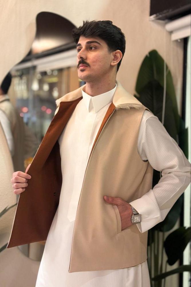 أناقة ملكية بكل معنى الكلمة تناسب جميع الأعمار والمناسبات نقدمها لكم بمن دارين بكل احترافية وفن سديري رجالي فخم من مجموعتنا من أجمل ملابس رجالية بجودة مضمونة ومصنوع من الجوخ الأصلي يدويا كما يمكن لبسه على الجهتين كل جهة لون مع جيوب جانبية كما في الصورة