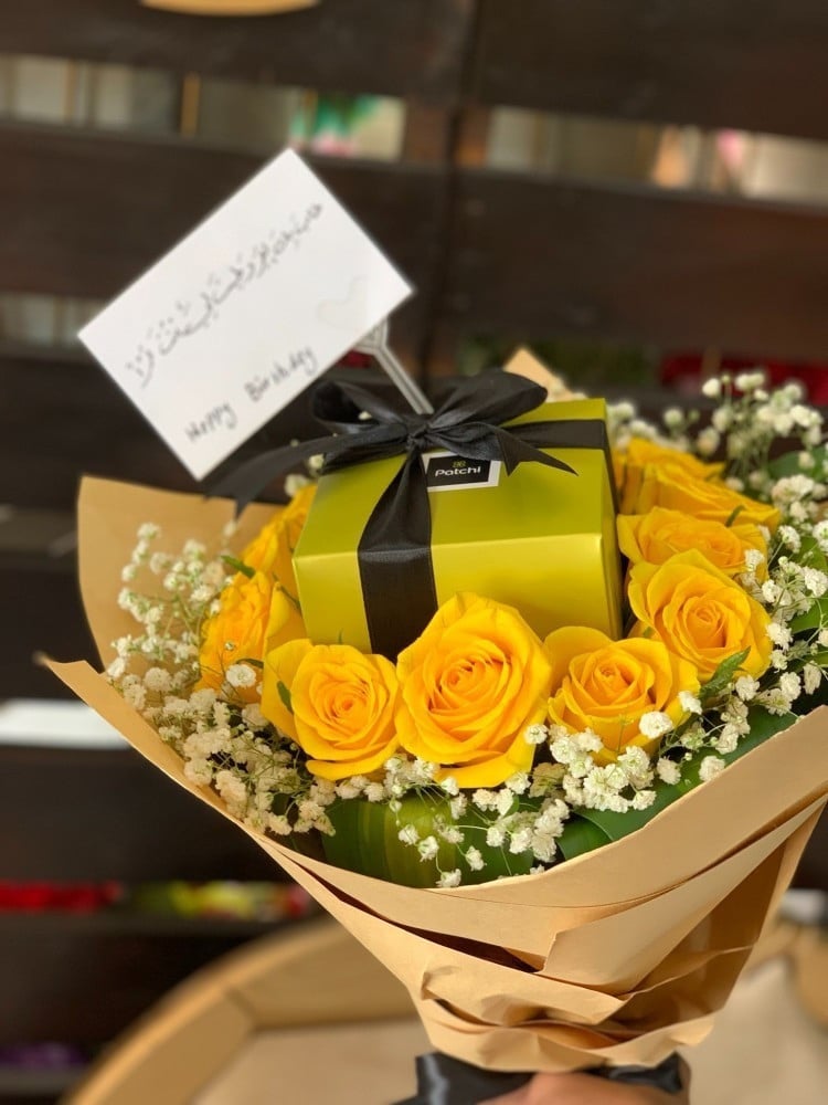 باقه ورد مكونه من :-اغصان جوري لون اصفراغصان الجيبسوفيليامن وقت لآخر قد يندر وجود بعض الورود لدى الموزعين المحليينوقد يستبدل منسقو الورود لدينا بعض التنسيقات في باقتك بسبب الظروف التي يمر بها الورد من اختلاف في اللون او الشكل